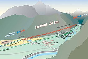 Der Teilabschnitt „Erstfeld“ besteht aus zwei parallelen Einspurröhren mit je 7,4 km. Die Gesamtlänge des Gotthard-Basistunnels beträgt 57 km.